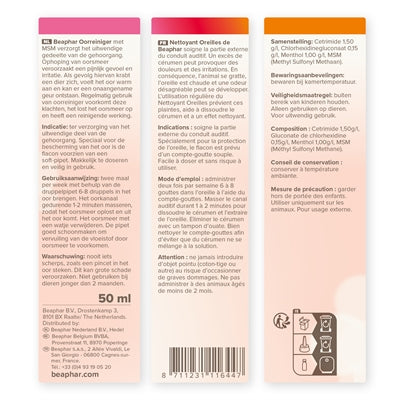 Beaphar oorreiniger met MSM verzorgt het uitwendige gedeelte van de gehoorgang. Ophoping van oorsmeer veroorzaakt een pijnlijk gevoel en irritatie....