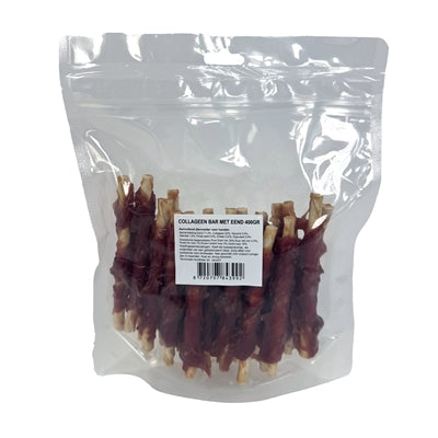 Samenstelling: Eend (71,3%), collageen (22%), glycerol (3,5%), zetmeel (1,5%), pinda-eiwit (0,5%), erwten (0,5%), soja-eiwit (0,5%)
