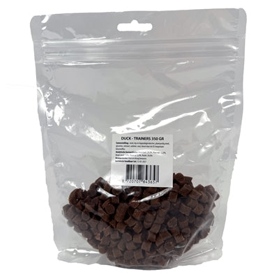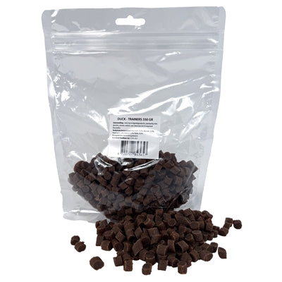 De I Am Duck Trainers zijn smaakvolle beloningssnacks met eend en kip, perfect voor tijdens het trainen of als verantwoord tussendoortje. Dankzij hun compacte formaat en zachte structuur zijn ze makkelijk te kauwen en ideaal voor snel belonen. De snacks zijn rijk aan eiwitten en bevatten geen overbodige toevoegingen – gewoon handig, lekker en effectief.