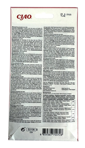 Inaba Churu Tuna/Salmon 4x14 gram is een romige aanvullende kattensnack van crème, rijk aan vocht en graanvrij. Katten hebben vaak de neiging om te weinig te drinken, wat tot dehydratatie kan leiden. Geef jouw kat daarom deze onweerstaanbare kattensnack van Churu! Deze heerlijke kattensnack bestaat uit een crème die in verdeelzakjes komt en rijk is aan vocht. Katten zijn gek op de romige structuur! Het heerlijke recept is graanvrij en bevat vitamine E. Zonder kunstmatige conserveringsmiddelen!