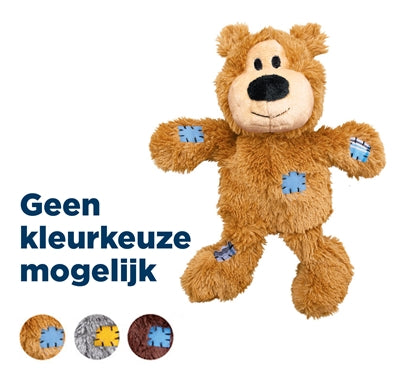 Stoeien, kauwen en spelen hoeft niet alleen met met de bekende flostouwen! Deze leuke berenknuffel van Kong heeft een skelet van touw. Door de minimale vulling, die zorgt voor minder troep, kan jouw hond door dit touwskelet lekker stoeien en bijten op deze knuffel. De knuffel heeft een pieper om speelgedrag nog meer te stimuleren. Door de pluche buitenkant is hij echter ook heel geschikt om mee te knuffelen. Deze beer komt in diverse natuurlijke kleuren en wordt assorti geleverd.