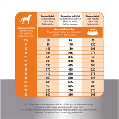 Samenstelling: Gedehydreerde kip (25%), mais, tarwe, rijst (9%), kippenvet, bietenpulp (2,3%), gehydrolyseerde lever, mineralen (kaliumchloride, natriumchloride), visolie (0.5%), gist, yucca schidigera extract (0.1%)