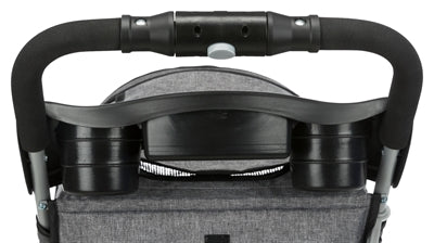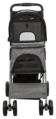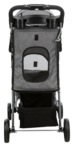 De Trixie Hondenbuggy Grijs 47X80X100 cm is een inklapbare hondenbuggy met vier wielen, eenhandsbediening en parkeerremmen. Deze buggy zorgt ervoor dat ook oude, zieke, angstige of zeer jonge honden en katten mee op pad kunnen. De buggy is comfortabel en veilig door de vier wielen, die voor meer stabiliteit zorgen, en de twee parkeerremmen. Bedienen kan met één hand door de duwstang: zo kun je ook nog een andere hond aan de lijn meenemen. De duwstang, fleshouder en het mandje zijn bovendien gevoerd voor meer comfort. Een grote achterklep helpt bij het in en uitstappen en de korthouders (twee stuks) voorkomen dat het dier per ongeluk uit de buggy kan springen. Je kunt de buggy deels of geheel afgesloten gebruiken door de ritssluitingen en hem zo aanpassen op elk weertype en elke passagier. Ook in dichte toestand is er voldoende ventilatie en zicht door de gaas-inzetstukjes. Deze buggy komt met een uitneembaar kussen met afneembare bekleding.