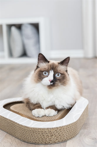De Trixie Krabplank Karton Met 2 Ballen van 36 x 36 x 5 cm is een originele krabplank met twee balletjes binnen voor extra aantrekkelijkheid en speelplezier. Zo zal jouw kat nog eerder geneigd zijn aan de krabplank te krabben niet aan jouw meubilair! De krabplank is driehoekig en uitgevoerd met een bovenkant in een leuke print. De plank zelf is gemaakt van karton dat verrijkt is met catnip. Binnenin de krabplank is een spoor gemaakt waarin twee balletjes geplaatst zijn, waar jou kat mee kan spelen door ze heen en weer te tikken door het vorm. Zo combineert Trixie krabben met spelen en hoeft jouw kat zich niet te vervelen!