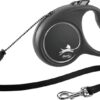 De Flexi Rollijn Black Design Cord Groen S 5 meter is een handige, stijlvolle looplijn met koord op rolmechanisme voor honden tot 12 kg. Deze nieuwe, zwarte uitvoering is stoer met een schattig tintje! De behuizing van de Black Design Flexi is zwart, met een groen Flexi-logo en de afbeelding van een hond. De lijn bestaat uit een stevig koord met musketonhaak op rolmechanisme, waardoor de hond meer ruimte heeft om te lopen. Met de knop bovenop kun je de lijn tijdelijk of permanent op een bepaalde lengte blokkeren. Een stijlvolle rollijn van de bekende Flexi-kwaliteit die de hond lekker veel bewegingsruimte biedt!