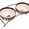 De Trixie Voerbak / Drinkbak Set Eat On Your Feet wit /zwart 2 x 0,25 l / 13 cm bestaat uit twee keramische bakken in slipvaste metalen standaard. Deze set is niet alleen handig, maar staat ook nog eens leuk in jouw interieur. De set bestaat uit twee witte bakken met zwarte accenten: de ene voerbak heeft aan de zijkant een opdruk ‘water’ en de andere ‘food’, met een corresponderende afbeelding op de bodem, namelijk een botje en een kraantje. Aan de binnenkant loopt een zwarte rand, die mooi aansluit bij de vorm van de zwarte, metalen houder. Deze is gebogen voor een sjieke uitstraling en voorzien van slipvaste rubberen voetjes. Zo kan jouw dier in alle rust eten zonder dat de bakken heen en weer schuiven.