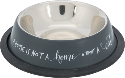 De Trixie Voerbak Kat RVS Anti Slip Grijs 200 ml is een moderne voerbak voor de kat, van RVS met print aan de buitenzijde en slipvaste ring. De grote ring zorgt ervoor dat jouw kat comfortabel kan eten zonder dat de bak door het hele huis schuift. Deze voerbak is uitgevoerd in donkergrijs met in witte letters de opdruk 'A house is not a home without a cat'. De binnenkant van de voerbak is van glad RVS en daardoor gemakkelijk schoon te maken.