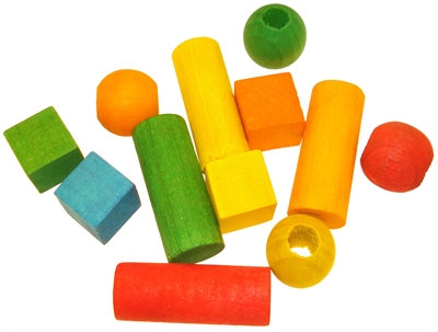 Deze houten blokjes zijn de navulling voor de Schatkist. De blokjes hebben opvallende kleuren die de aandacht van de vogel trekken.